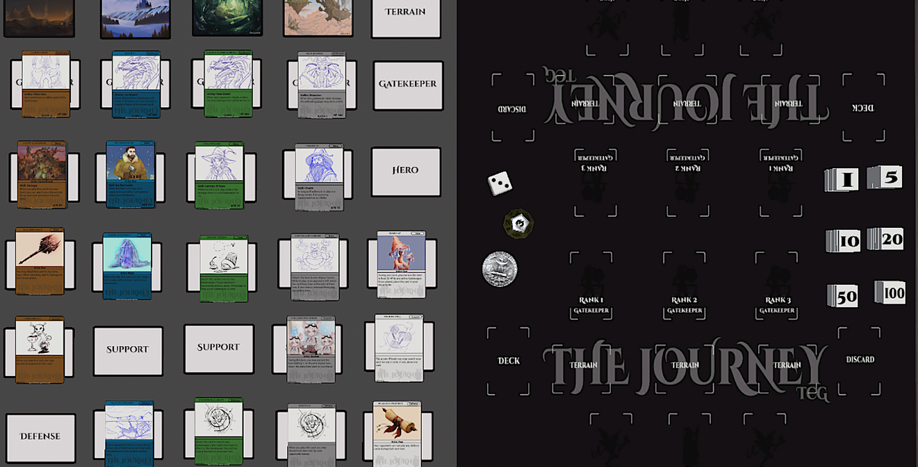 - i. Players Decks will contain 60 cards, consisting of a combination of help cards, block cards, hero cards. Additional to the deck, players will have 3 gatekeeper and 3 terrain cards.