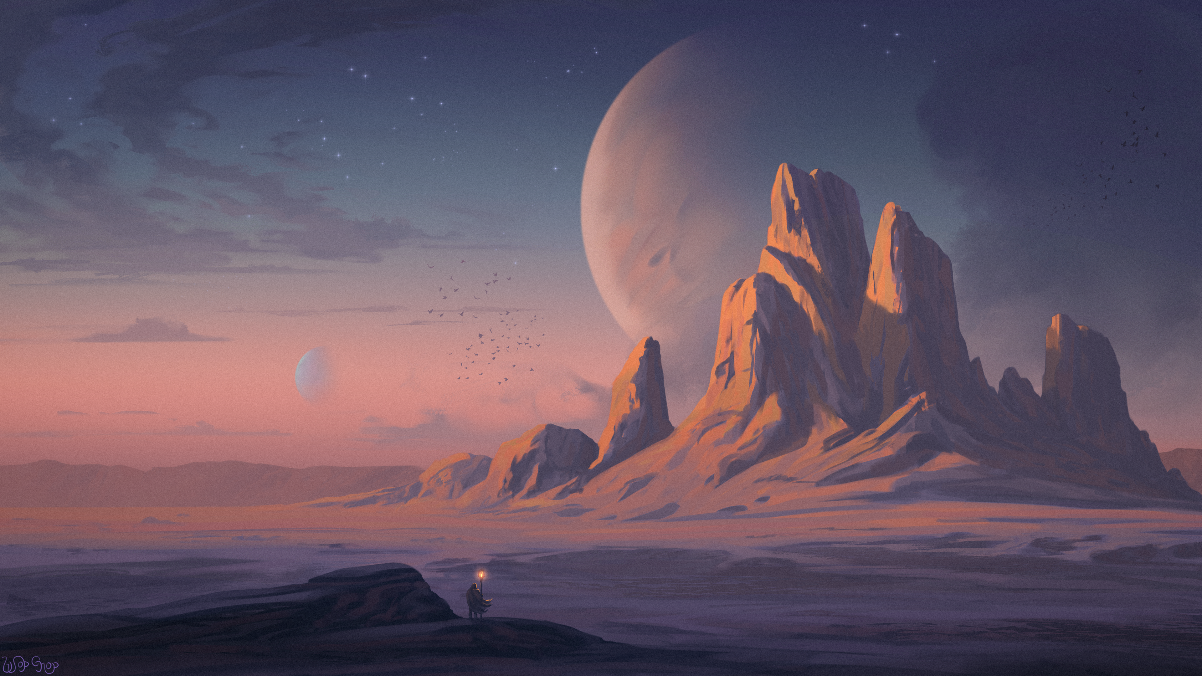 The Salt Wastes are an unforgiving desert, characterized by vast expanses of white salt flats, rocky outcrops, and relentless heat. During the day, temperatures soar to unbearable levels, while nights bring a bone-chilling cold. The air is dry, and the ground is covered with crystalline salt formations that shimmer under the harsh sun. Water is scarce, and the few sources that exist are closely guarded secrets.